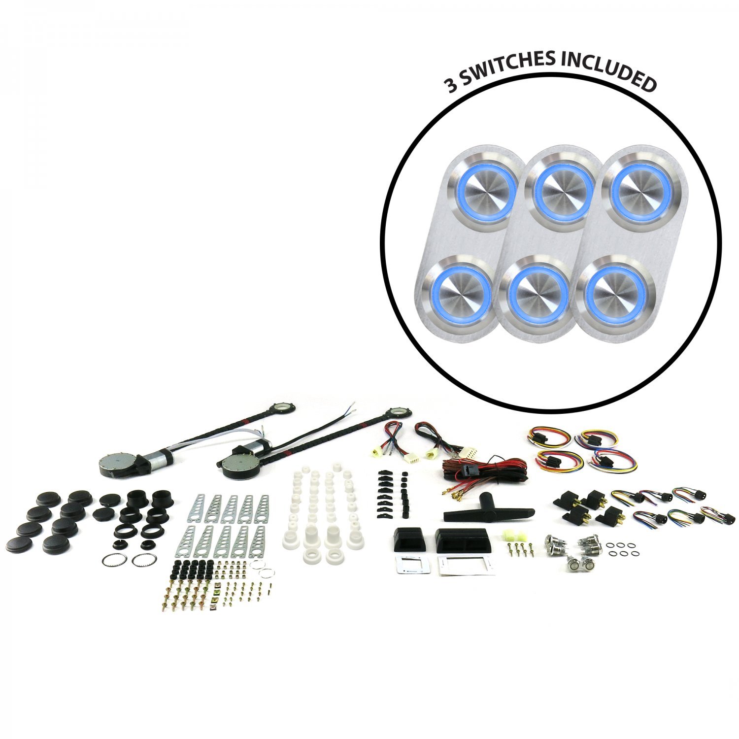 The AutoLoc Power Accessories 18501 2-Door Power Window Kit comes with 3 Daytona Billet Switches featuring blue illumination for a sleek look and easy operation. Enhance your vehicle with the convenience of power windows. MPN: 18501