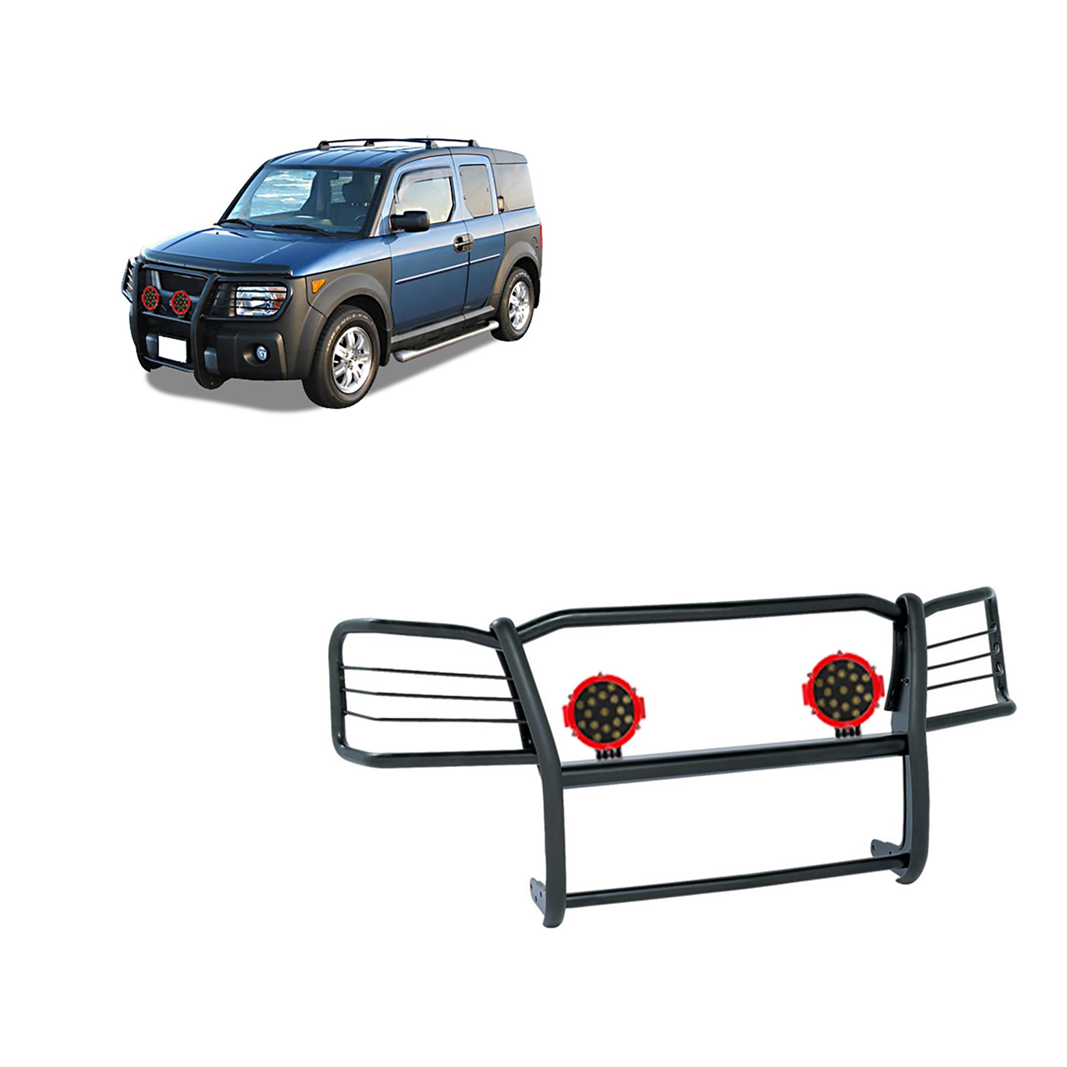 Black Horse Grille brush Bumper Guard Modular Black Come With pair of 7.0Dia.LED Lights with Red Trim Rings Compatible with 2003 2008 Honda Element 17A155900MA PLR